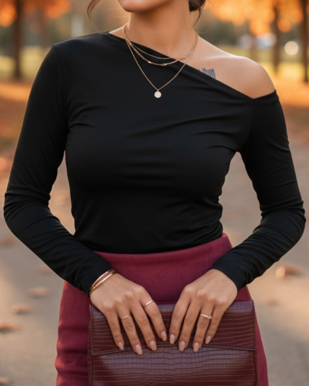 Luna — Camiseta manga larga negra con hombro asimétrico